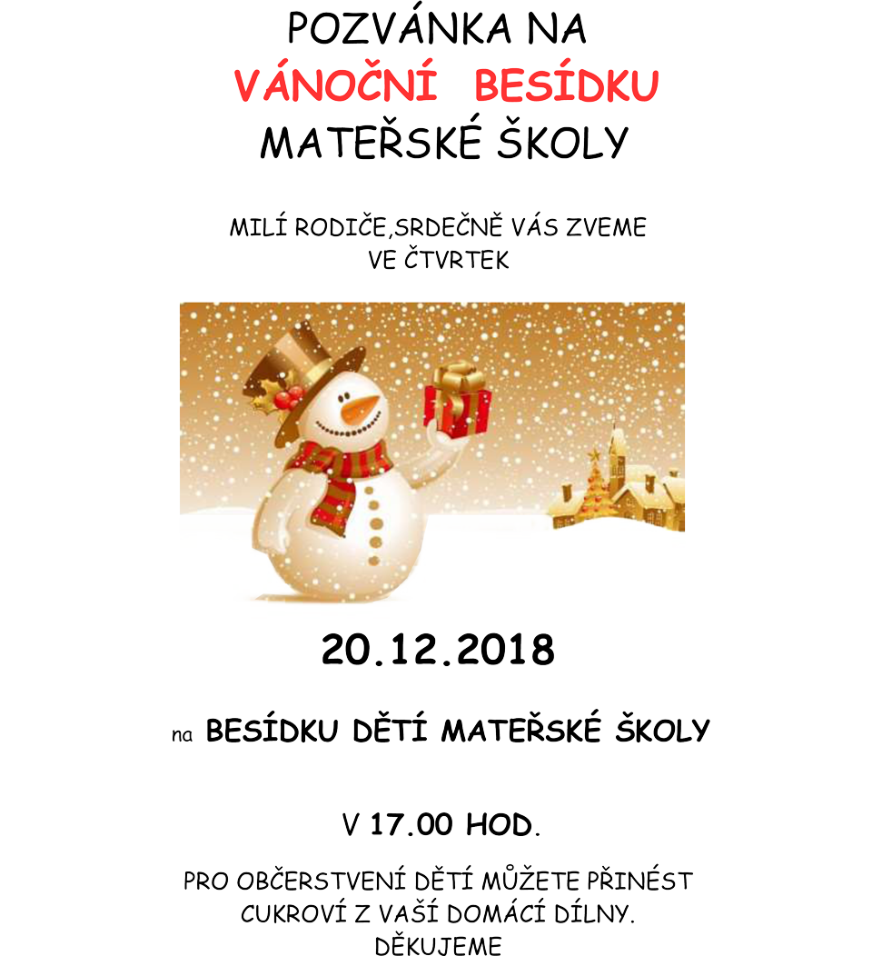 POZVÁNKA NA VÁNOČNÍ BESÍDKU MATEŘSKÉ ŠKOLYMILÍ RODIČE,SRDEČNĚ VÁS ZVEME VE ČTVRTEK 20.12.2018 na BESÍDKU DĚTÍ MATEŘSKÉ ŠKOLY V 17.00 HOD. PRO OBČERSTVENÍ DĚTÍ MŮŽETE PŘINÉST CUKROVÍ Z VAŠÍ DOMÁCÍ DÍLNY. DĚKUJEME
