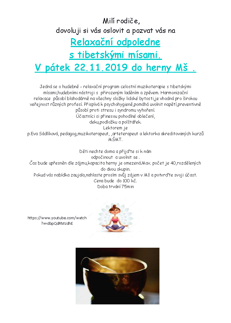 Účastníci si přinesou pohodlné oblečení, deku,podložku a polštářek.